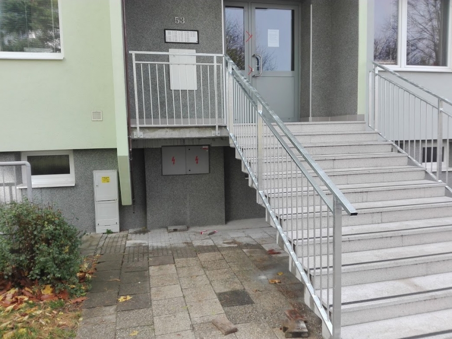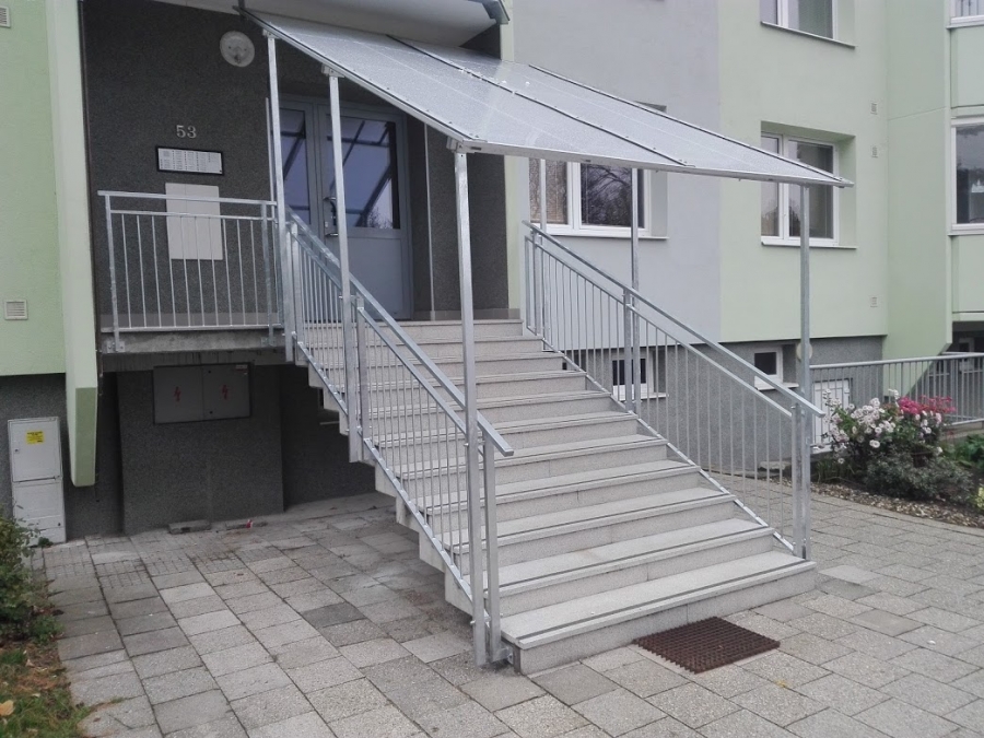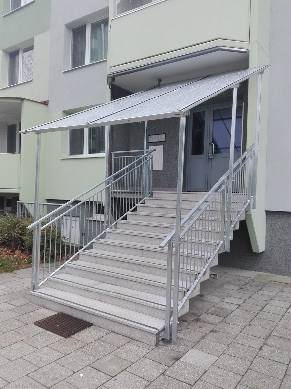 Po dohodě se SVJ jsme v Luhačovicích zastřešili vchod do paneláku a osadili nové zábradlí. Vše v pozinku
