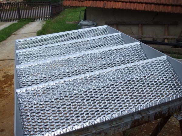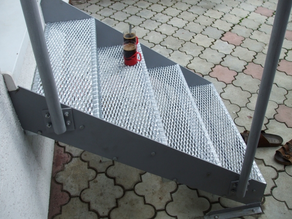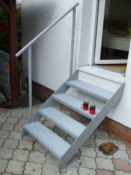 Majitel se u svého RD rozhodl vyměnit dřevěné schůdky bez zábradlí za bezpečnější schůdky se zábradlím a protiskluzovou úpravou.