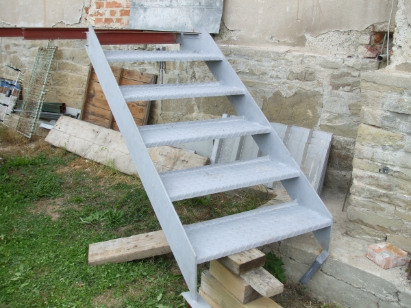 Při rekonstrukci RD u Vsetína se majiteli původní dřevěné schůdky rozpadly. Na schůdky bylo použito pásoviny a slzičkového plechu.